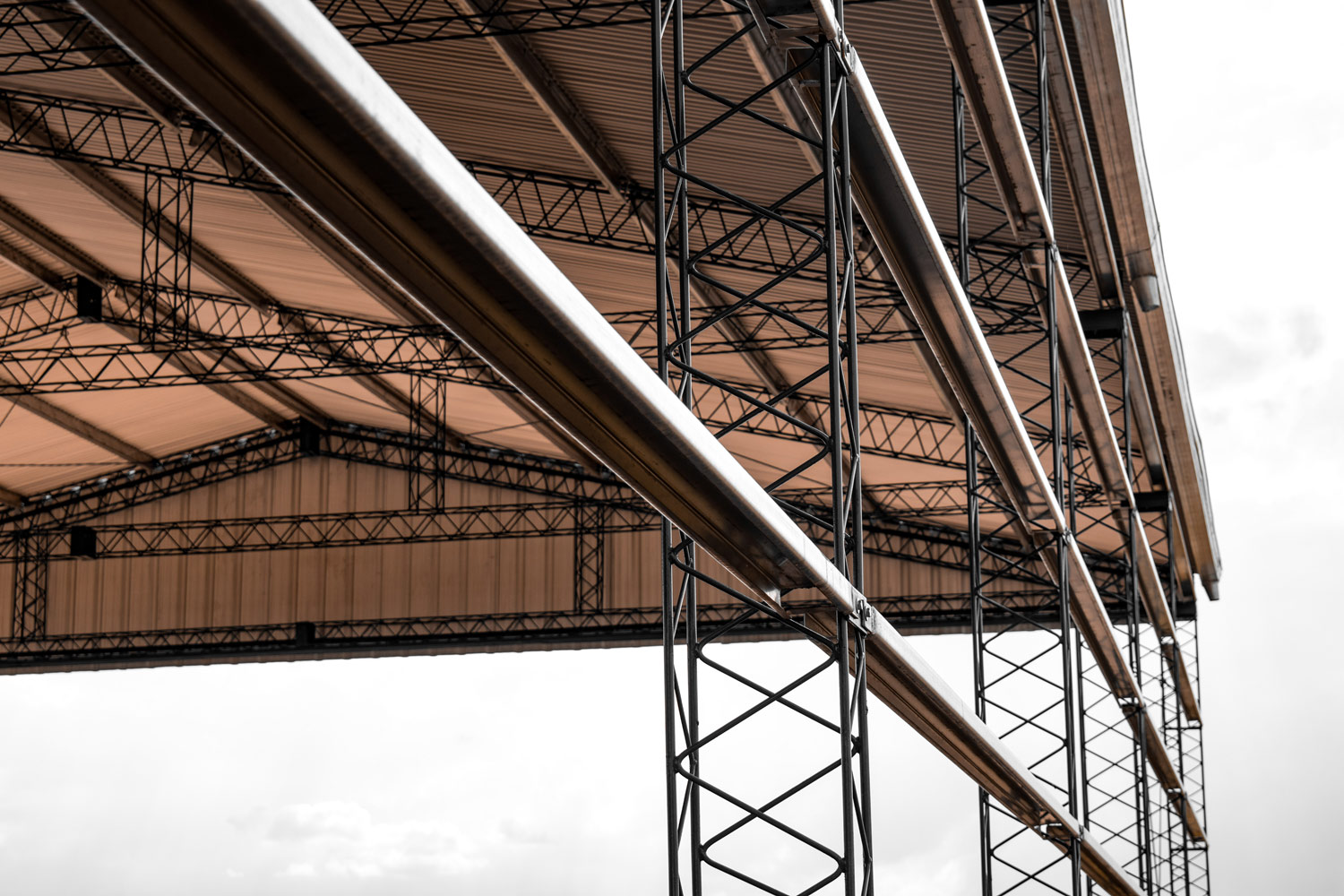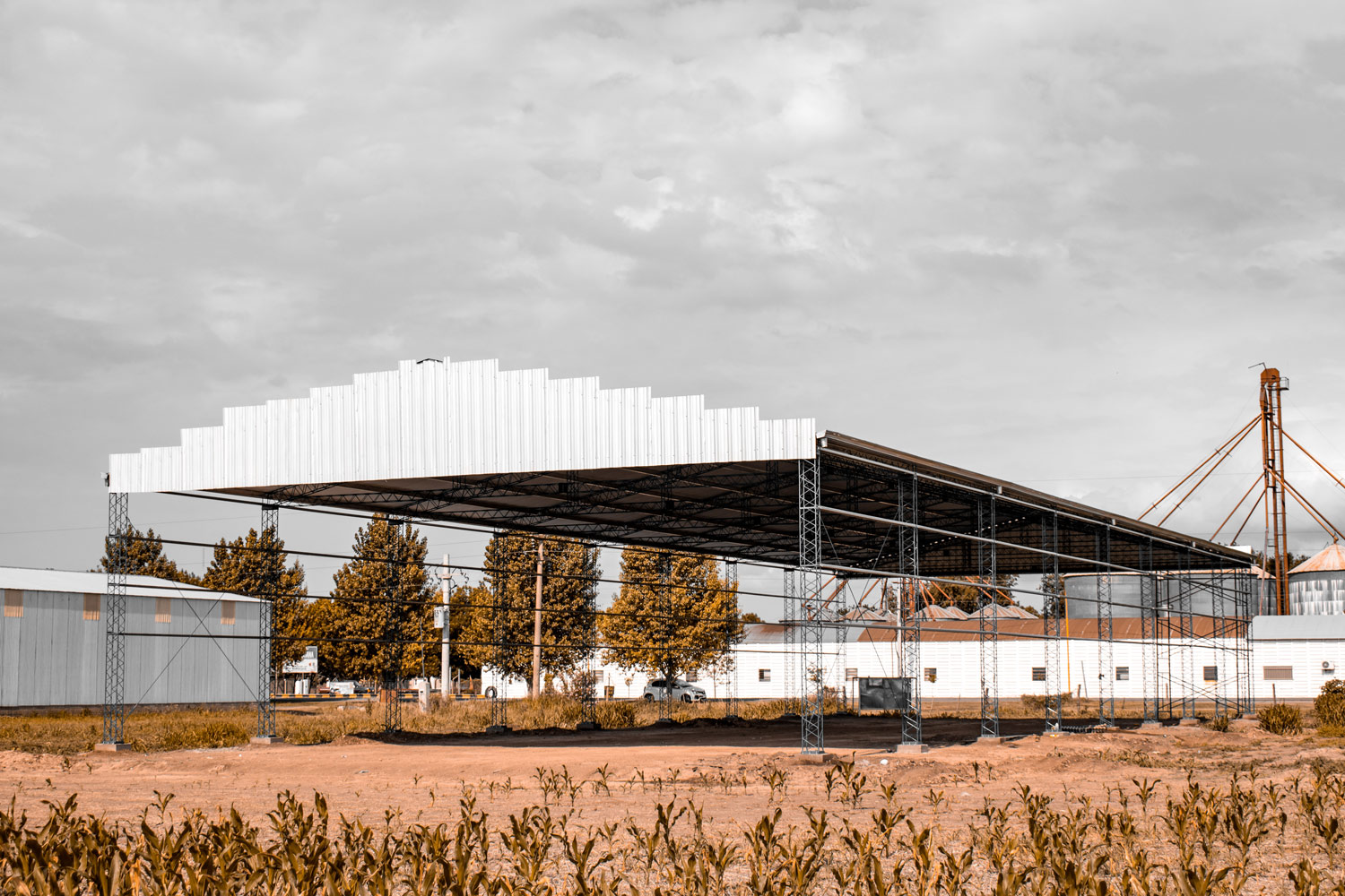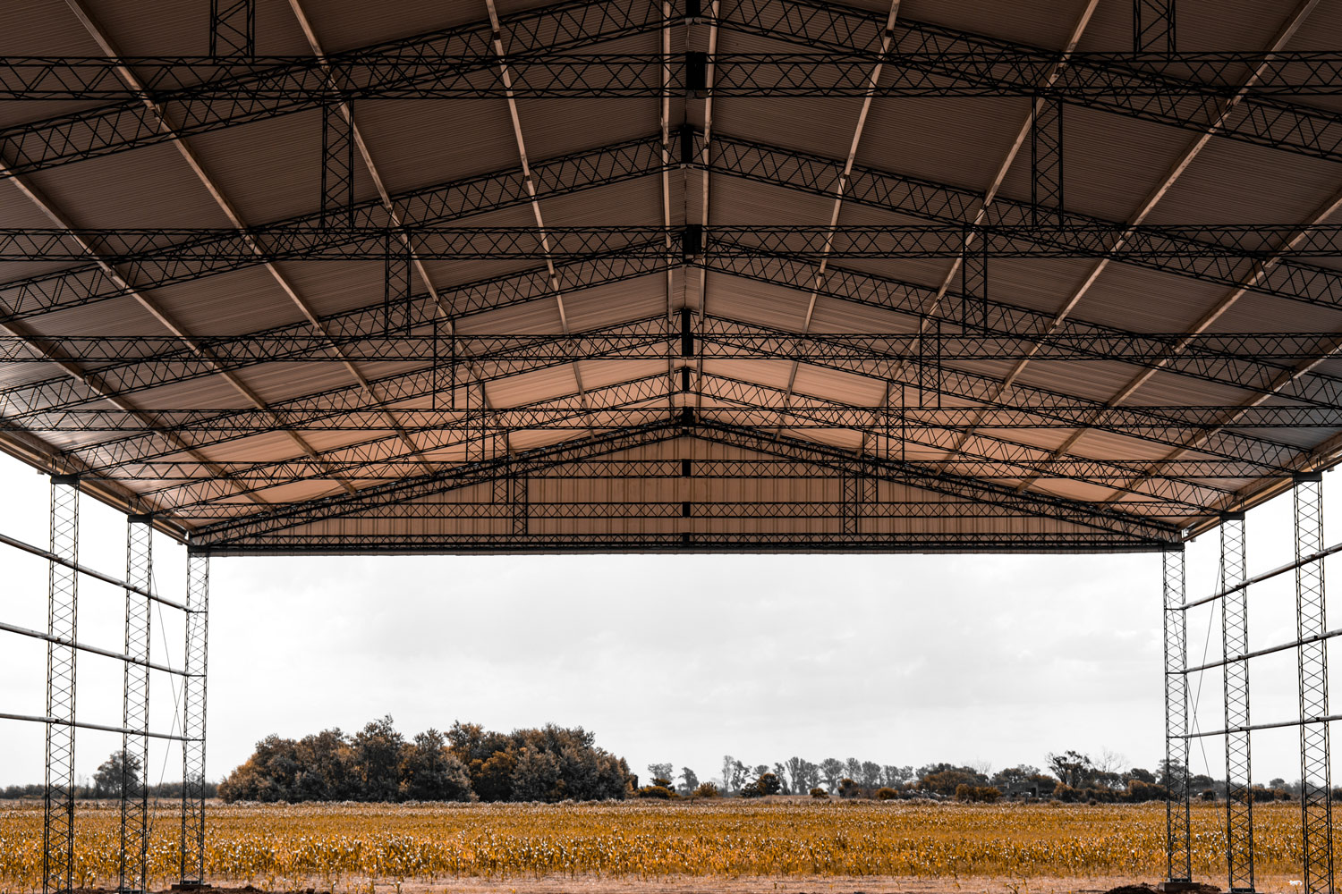Estructura de hierro redondo reticulado, totalmente abulonado, similar al galpón, con la diferencia que no lleva los laterales chapeados, permitiendo así el ingreso más cómodo y temporal para guardar maquinarias agrícolas.